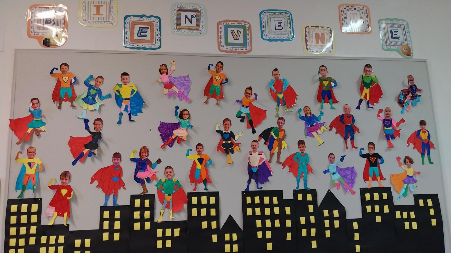 Ils ont découvert leur nouvelle classe et leur nouveau matériel… Pour l’heure, ils se sont transformés en SUPER HÉROS pour se donner la force et le courage nécessaire pour apprendre plein de nouvelles choses. Ils sont également ravis de retrouver leurs camarades sur la cour de récréation et les nouveaux jeux mis à disposition.