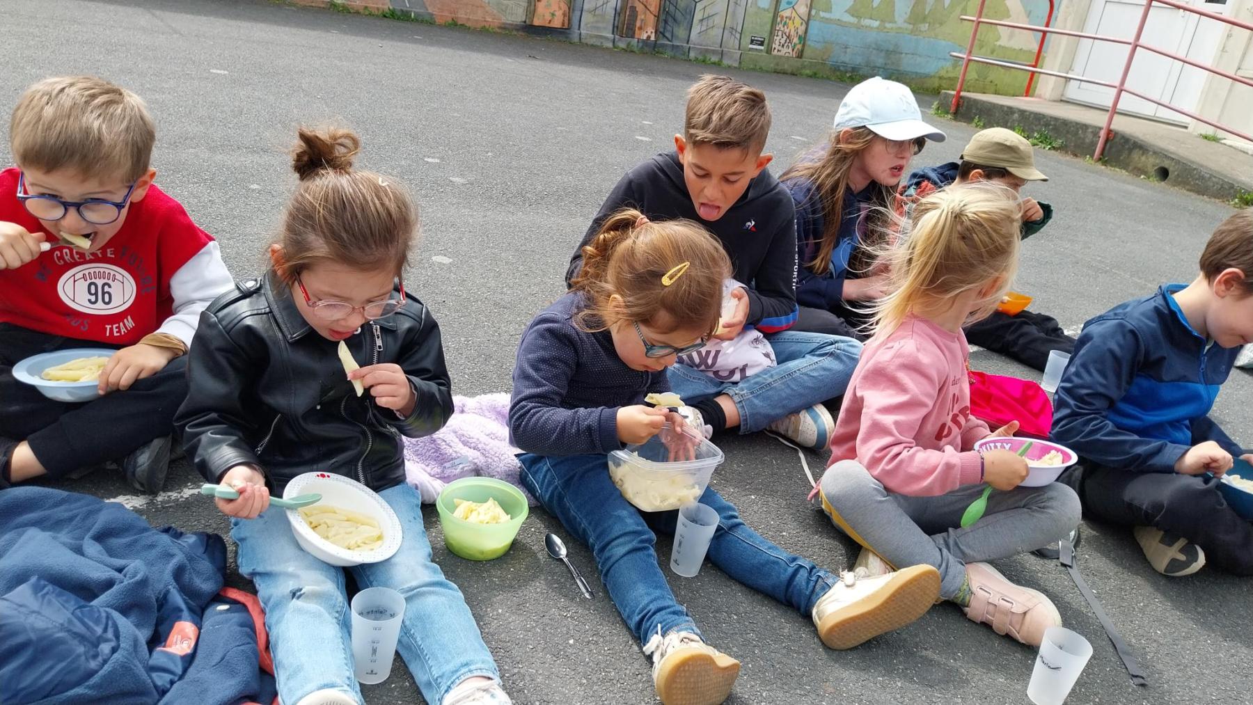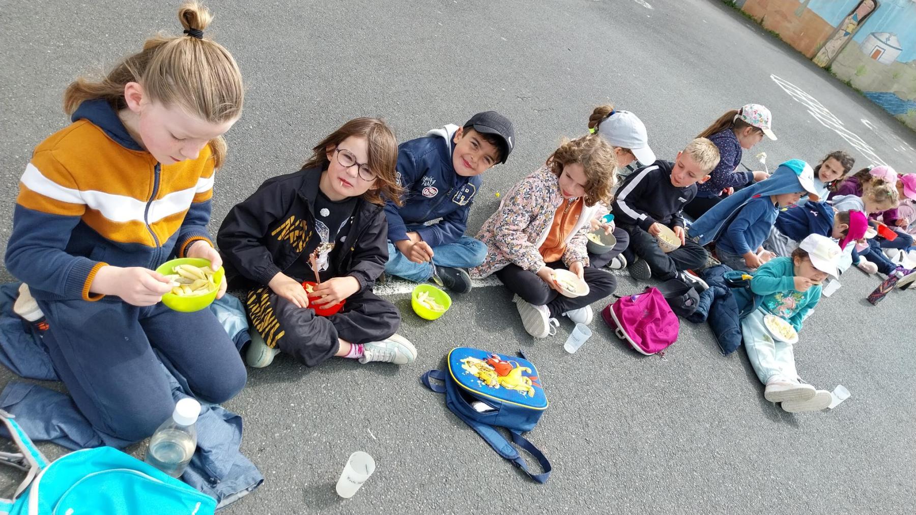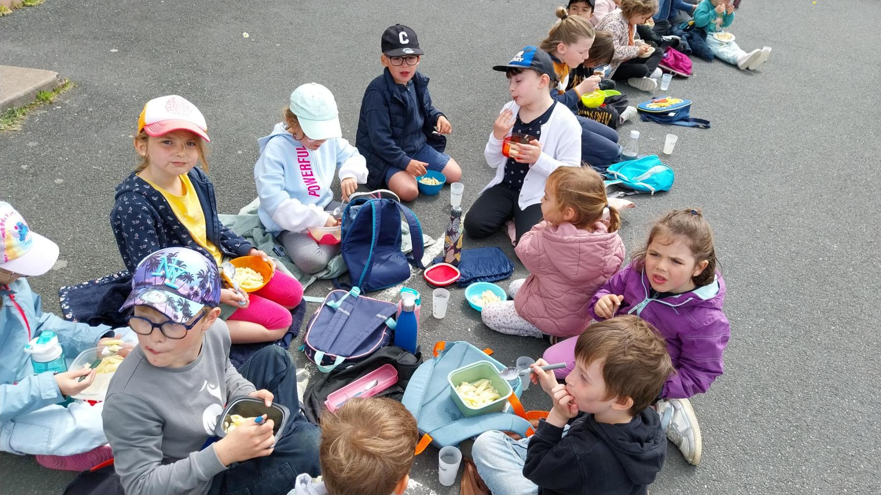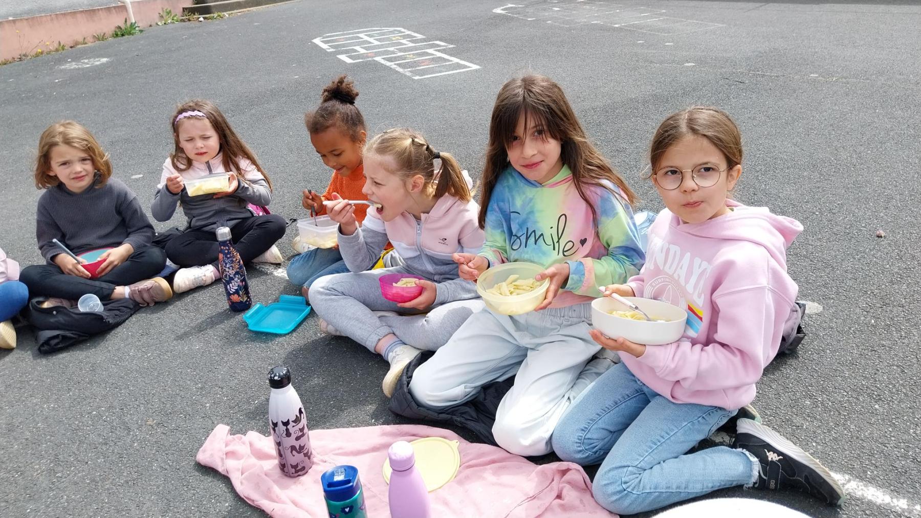 Suite à la marche solidaire effectuée avec les membres du club des aînés et accompagnés de leurs parents ou grands-parents, les élèves de l’école, de la PS jusqu’au CM2, se sont retrouvés sur la cour pour partager un bol de pâtes, symbolisant l’entrée dans la période de Carême.