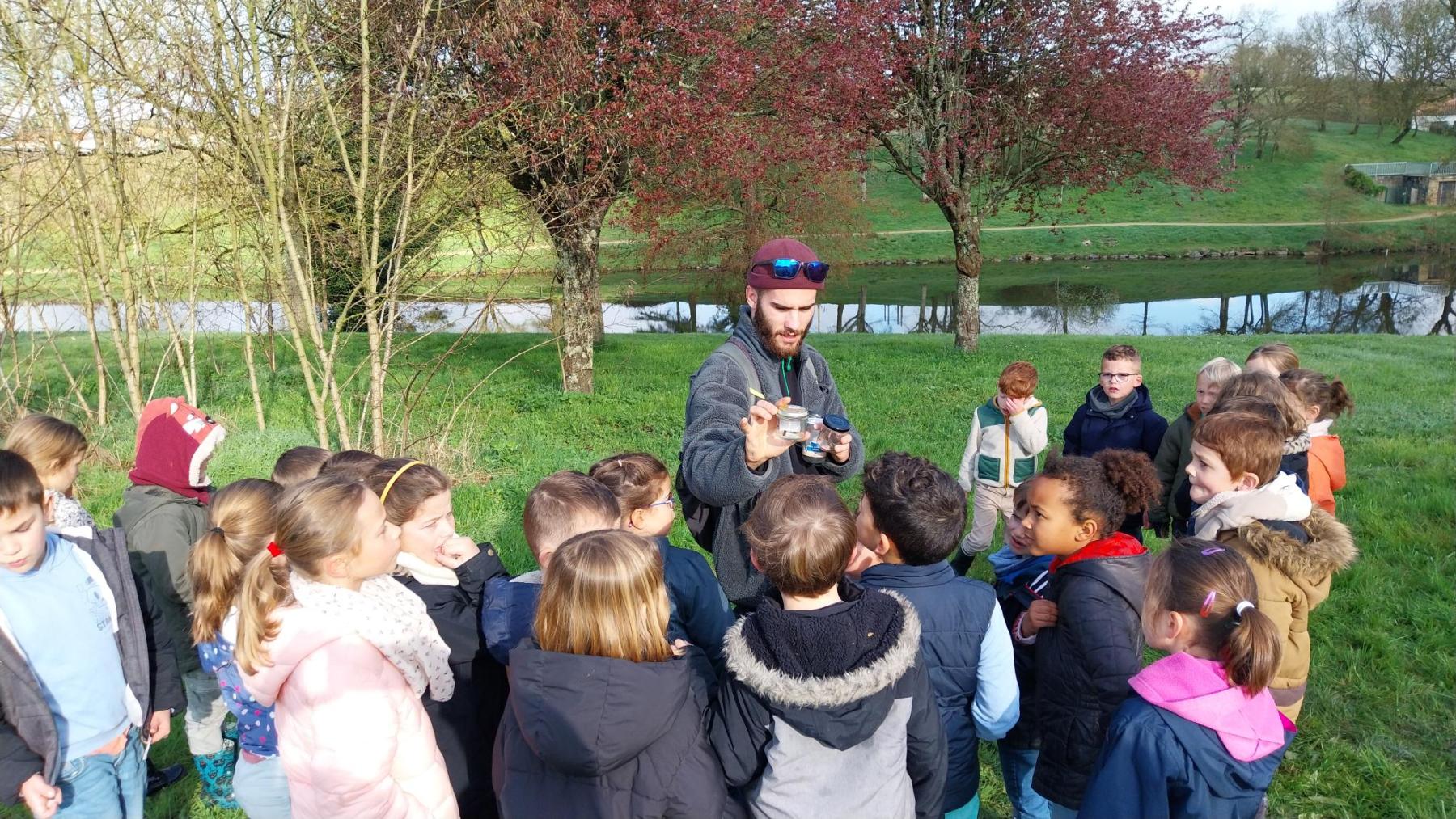 Titouan est venu pour terminer son chapitre sur la biodiversité. Les élèves sont allés observés les être vivants autour de l’étang des Nouëlles. Equipés de bottes et munis de filets à papillon, loupes et boîtes d’observation, les élèves ont attrapé des insectes et les ont observés avant de les relâcher dans la nature. Ainsi, les sauterelles, les coccinelles, les papillons, les vers de terre et les gendarmes ont suscité l’intérêt de nos explorateurs en herbe ! Ensuite, Titouan a expliquer le rôle de chaque insecte dans la nature et nous avons aborder la notion de chaîne alimentaire (qui mange qui et qui se fait mangé par qui ?)